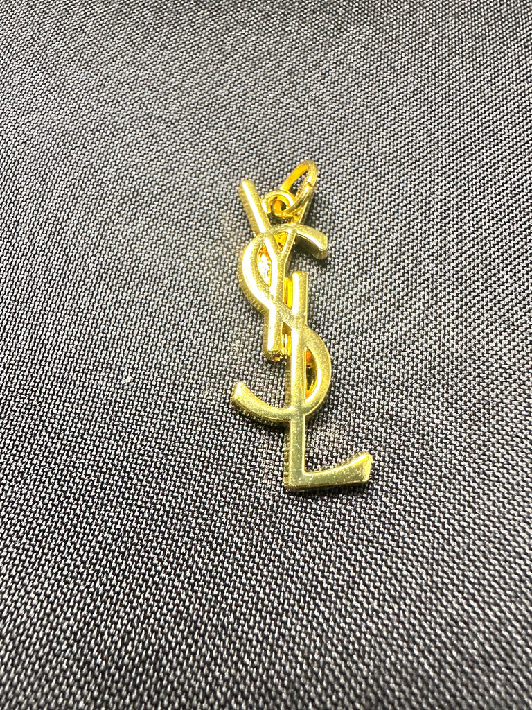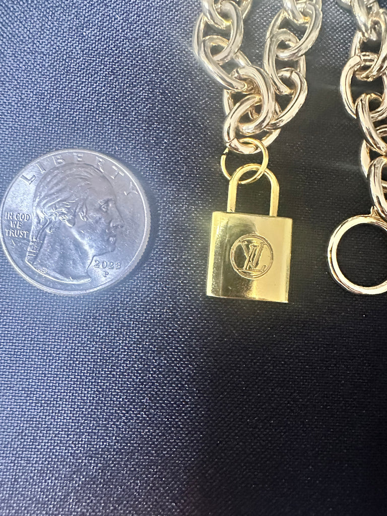 Gold LV! This is an authentic upcycled Louis Vuitton charm. Comes with an unbranded chain as a FREE bonus, the FREE chain we send will depend on which styles we have available. This pendant can be put on a multitude of chain styles to obtain a different look. Can also be added to your designer bags as a bag charm to enhance its beauty!